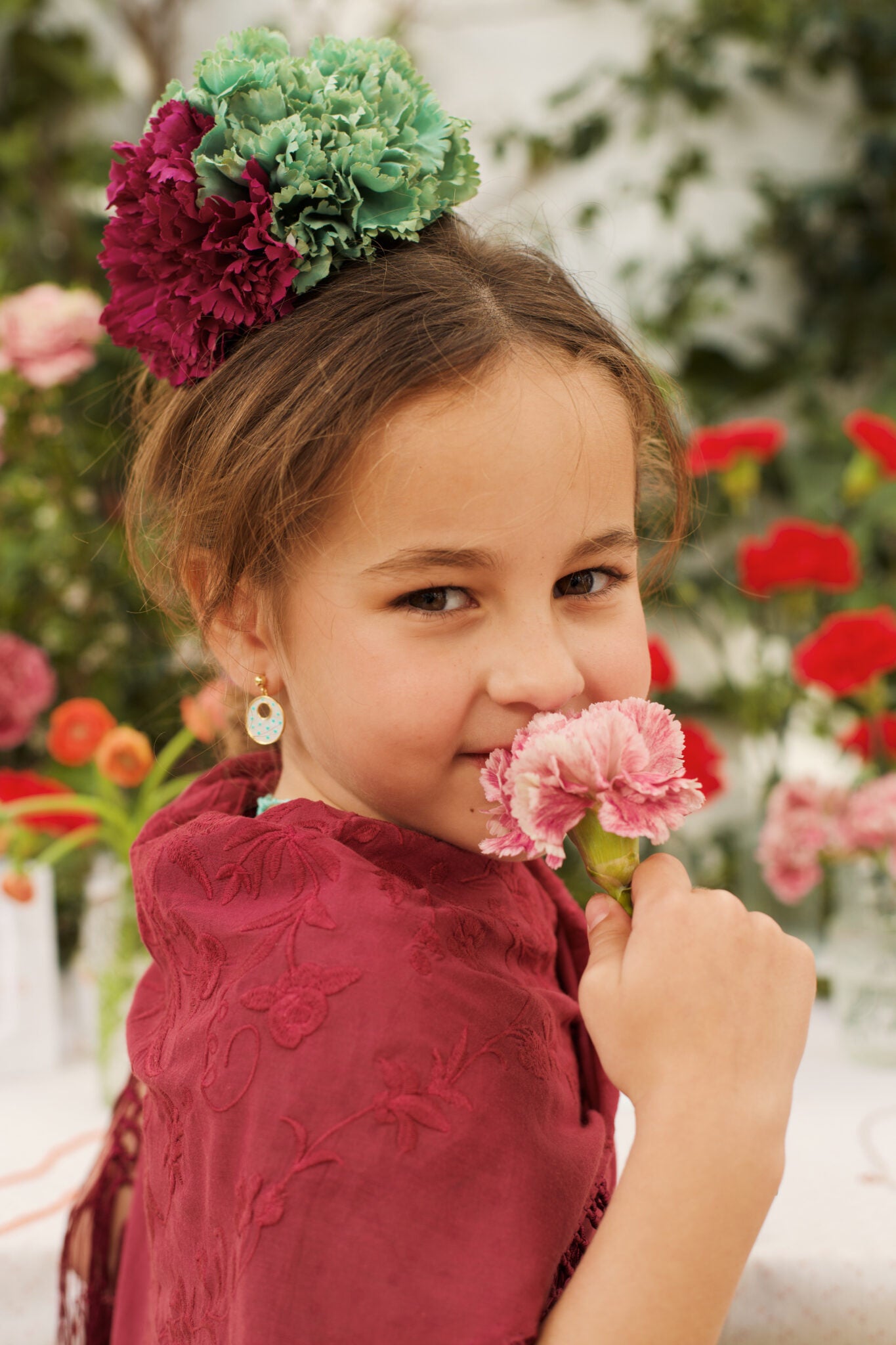 La colección Entre Petras y lunares, es la primera que realizamos de flamenca para nuestras niñas. La necesidad nos surgió al no encontrar pendientes de calidad para acompañar a los mantoncillos y vestidos tan elaborados.