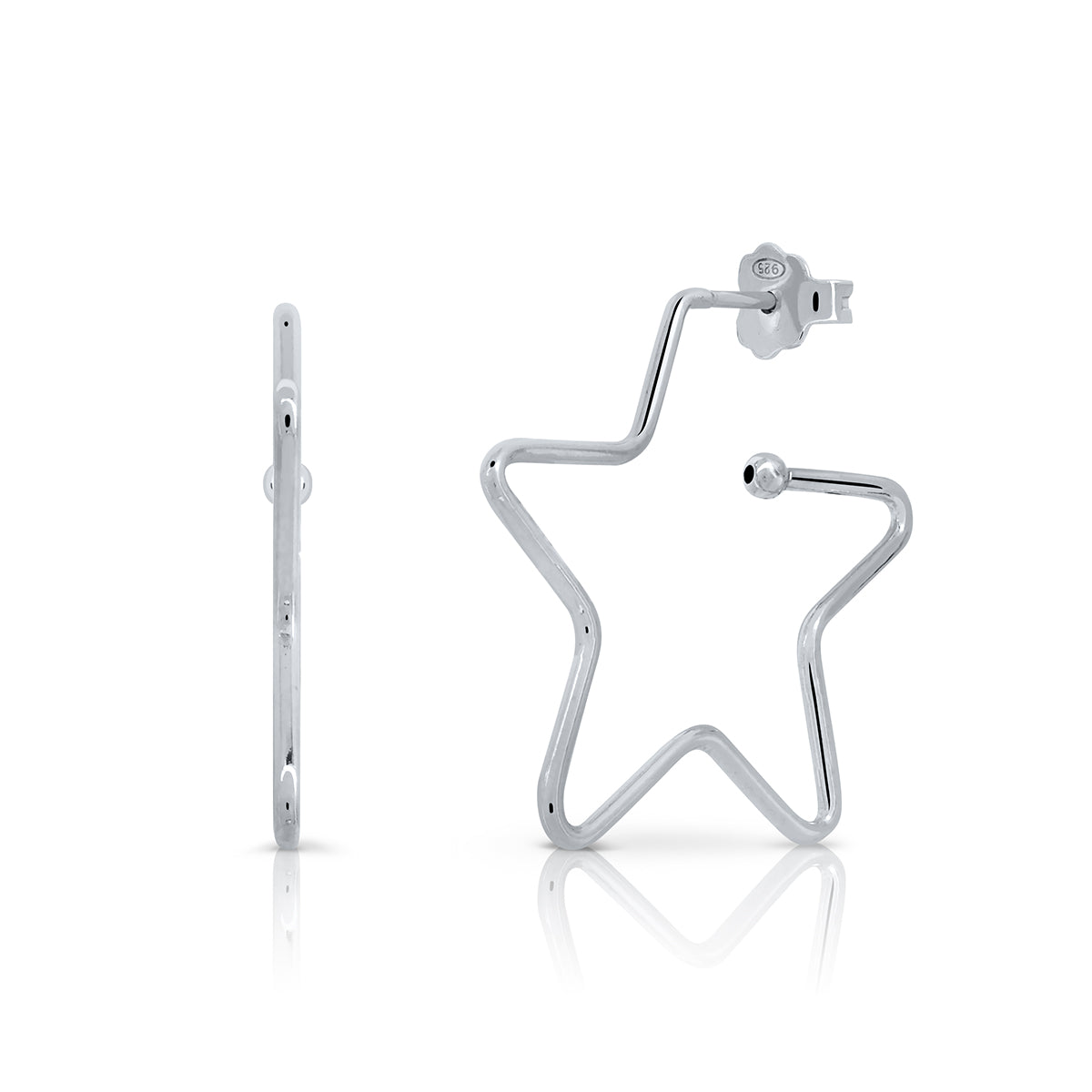 Pendientes de diseño original en forma de estrella, elaborados en plata. Su estructura está formada por un alambre continuo que traza con precisión los cinco picos de la estrella, creando una silueta abierta, ligera y moderna.