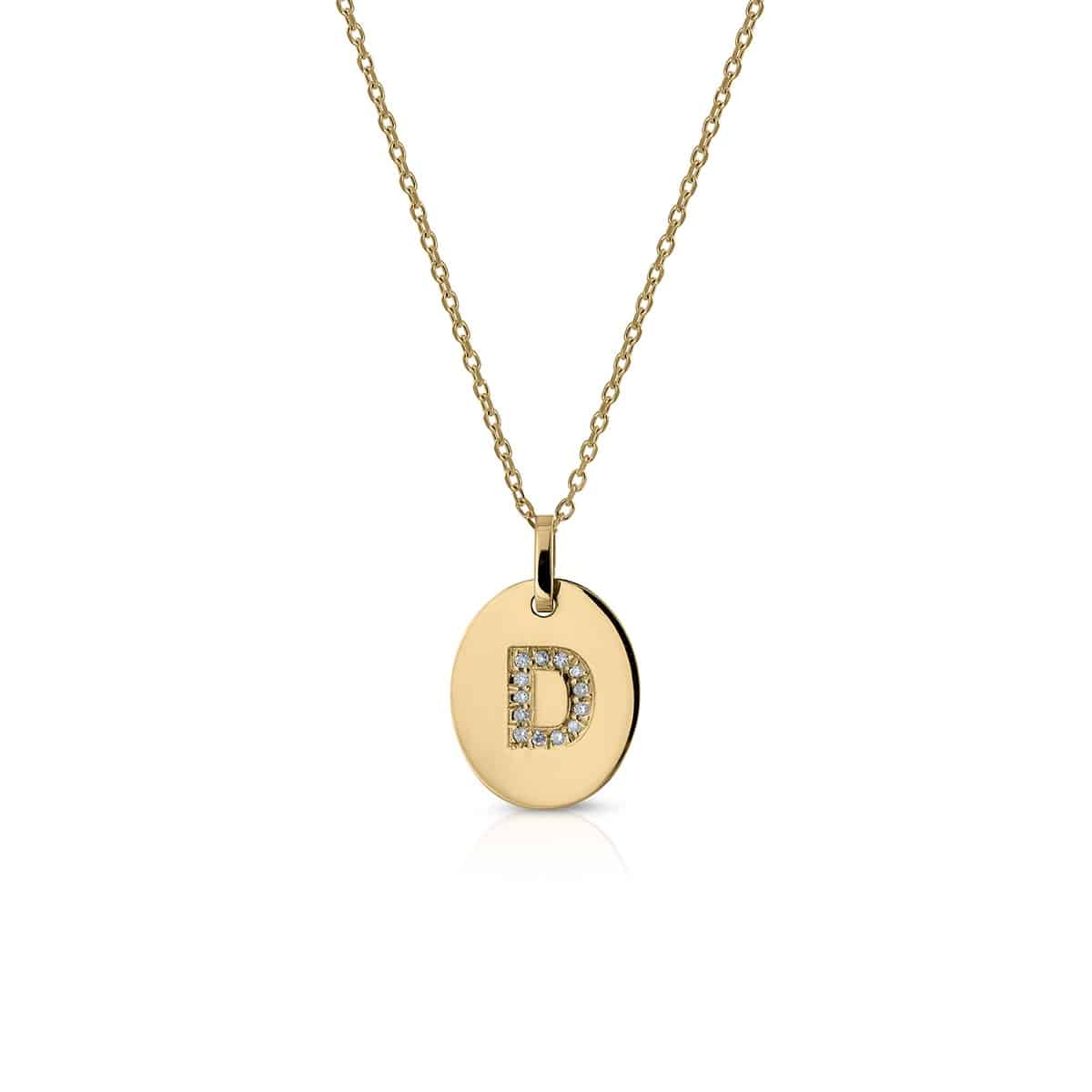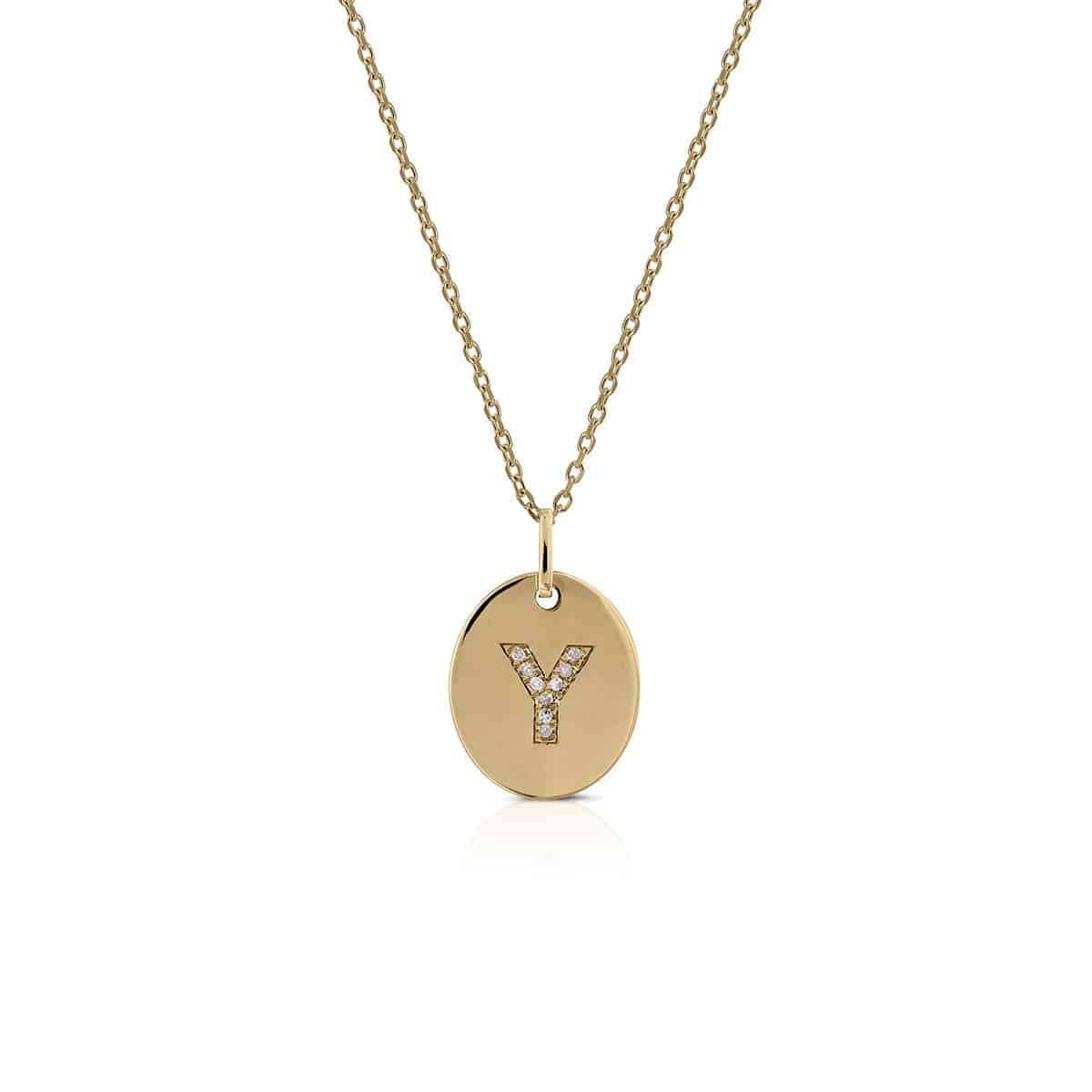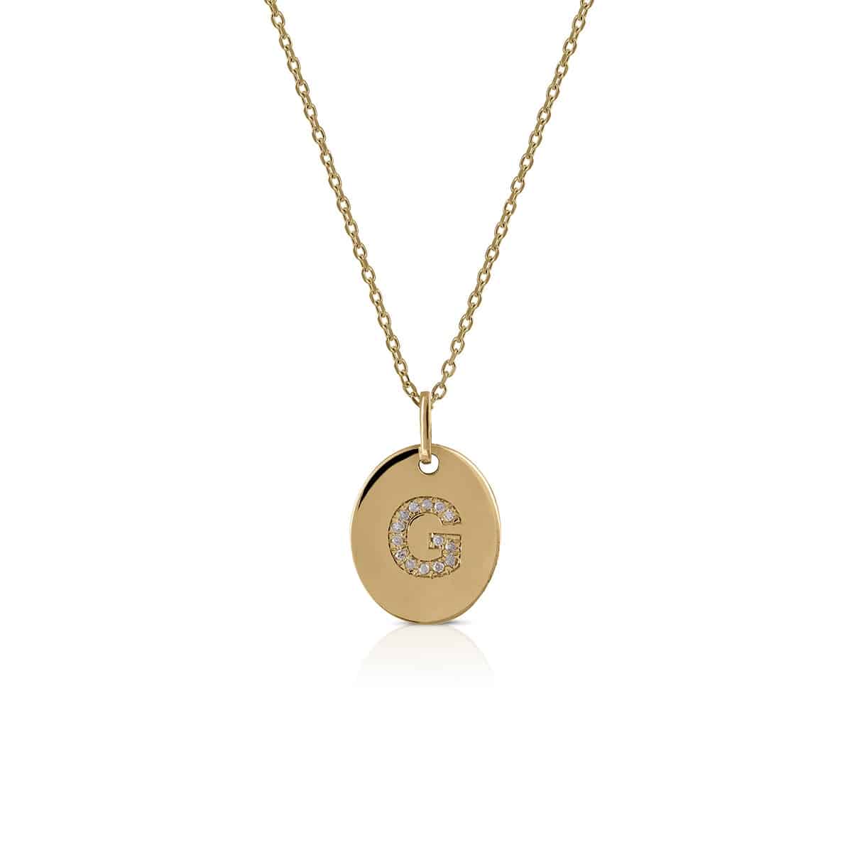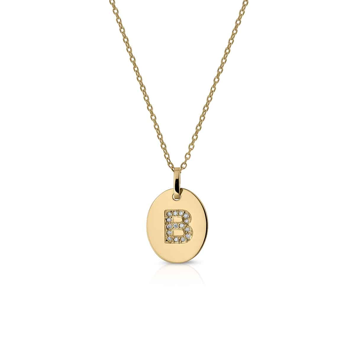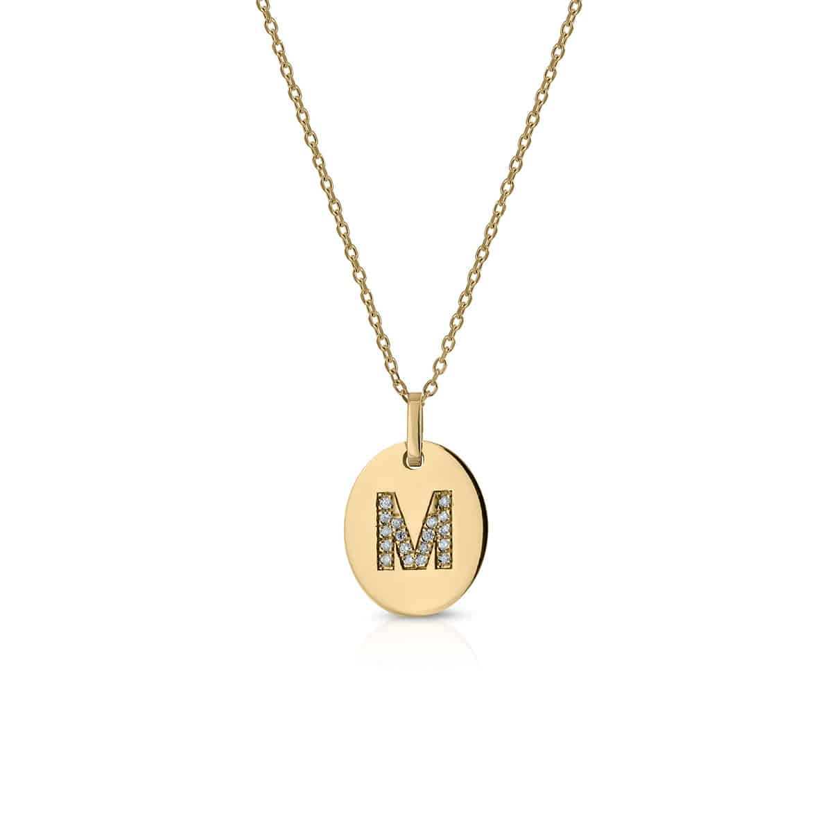Gold necklace with initial medal in brilliant-cut diamonds.